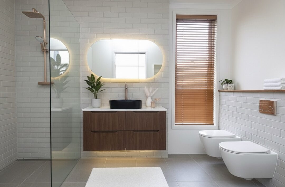 Stunning wall-hung vanity exudes modern elegance in a warm walnut finish with stone or moulded ceramic top.